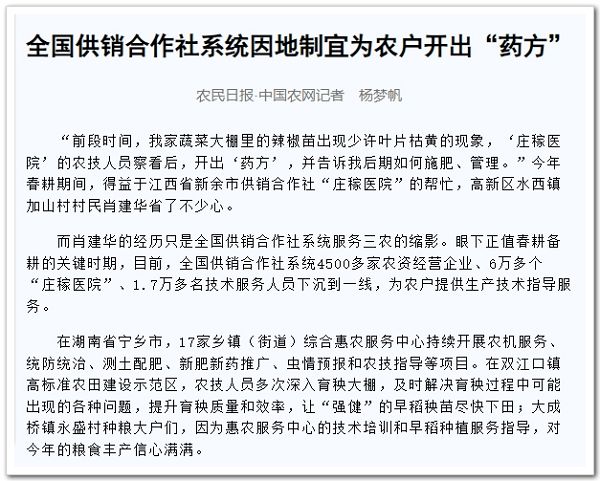 中華全國供銷合作總社相關負責人表示,為了滿足春耕大忙時節(jié)農(nóng)民的實際需求,全國供銷合作社系統(tǒng)因地制宜開展生產(chǎn)性全程托管服務和配方施肥、統(tǒng)防統(tǒng)治、農(nóng)機作業(yè)等農(nóng)業(yè)社會化服務,充分發(fā)揮點多面廣、貼近基層的優(yōu)勢,不斷提升服務水平,為打好全年農(nóng)業(yè)生產(chǎn)“第一仗”貢獻供銷力量。