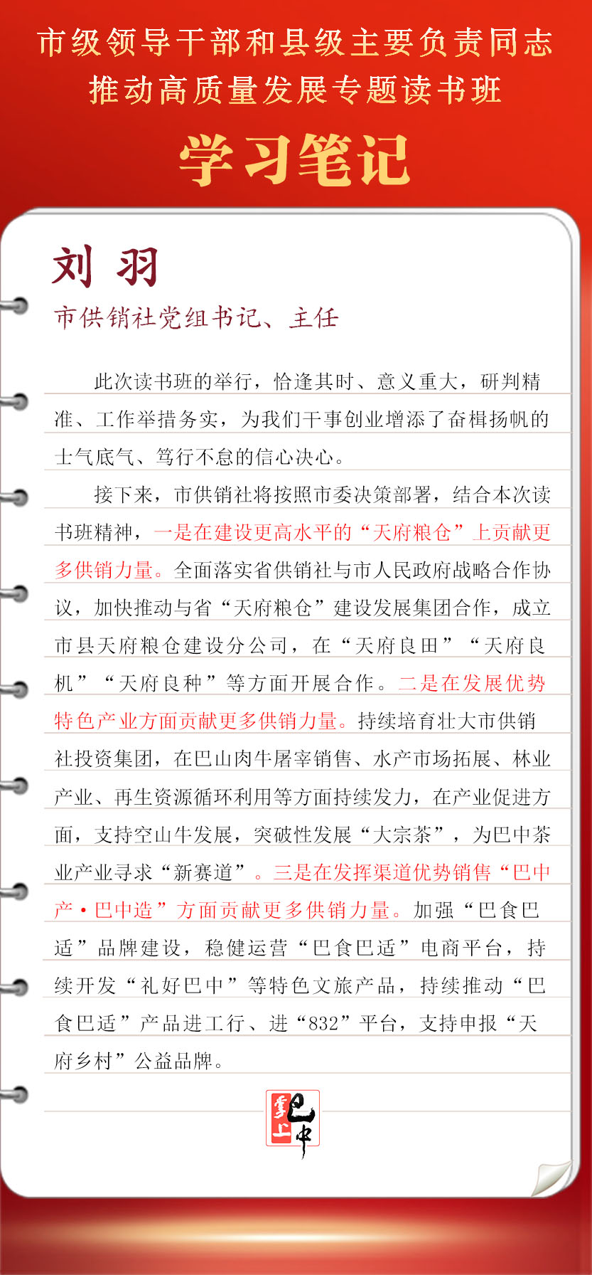 接下來,市供銷社將按照市委決策部署,結(jié)合本次讀書班精神,全面落實(shí)省供銷社與市人民政府戰(zhàn)略合作協(xié)議,加快推動與省“天府糧倉”建設(shè)發(fā)展集團(tuán)合作,成立市縣天府糧倉建設(shè)分公司,在“天府良田”“天府良機(jī)”“天府良種”等方面開展合作。持續(xù)培育壯大市供銷社投資集團(tuán),在巴山肉牛屠宰銷售、水產(chǎn)市場拓展、林業(yè)產(chǎn)業(yè)、再生資源循環(huán)利用等方面持續(xù)發(fā)力,在產(chǎn)業(yè)促進(jìn)方面,支持空山牛發(fā)展,突破性發(fā)展“大宗茶”,為巴中茶業(yè)產(chǎn)業(yè)尋求“新賽道”。加強(qiáng)“巴食巴適”品牌建設(shè),穩(wěn)健運(yùn)營“巴食巴適”電商平臺,持續(xù)開發(fā)“禮好巴中”等特色文旅產(chǎn)品,持續(xù)推動“巴食巴適”產(chǎn)品進(jìn)工行、進(jìn)“832”平臺,支持申報(bào)“天府鄉(xiāng)村”公益品牌。